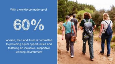 “With a workforce made up of 60% women, the Land Trust strives to create a working environment which is inclusive and supportive at all levels. Equitable opportunities for career development are essential, along with flexible employee benefits which have been proven to be key in closing the gender pay gap and advancing gender equality.